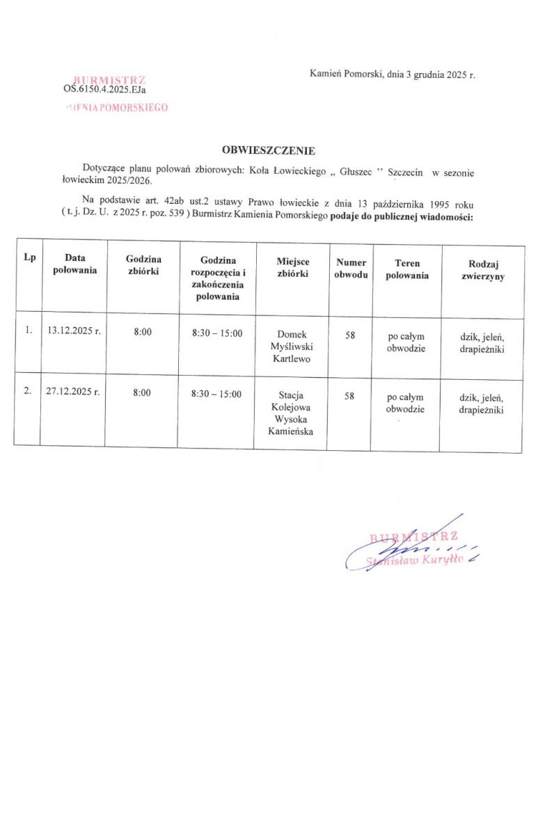 OBWIESZCZENIE Dotyczące planu polowań zbiorowych: Koła Łowieckiego ,, Głuszec ’’ Szczecin w sezonie łowieckim 2025/2026.