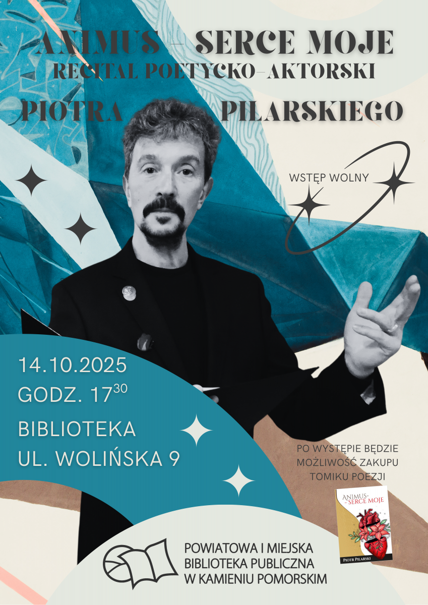 Zapraszamy 14 października (wtorek) na godzinę 17.30 do Powiatowej i Miejskiej Biblioteki Publicznej w Kamieniu Pomorskim na recital poetycko-aktorsko-muzyczny Piotra Pilarskiego, aktora Ostrowskiego Teatru Nasz Teatr, pod tytułem ANIMUS - SERCE MOJE.